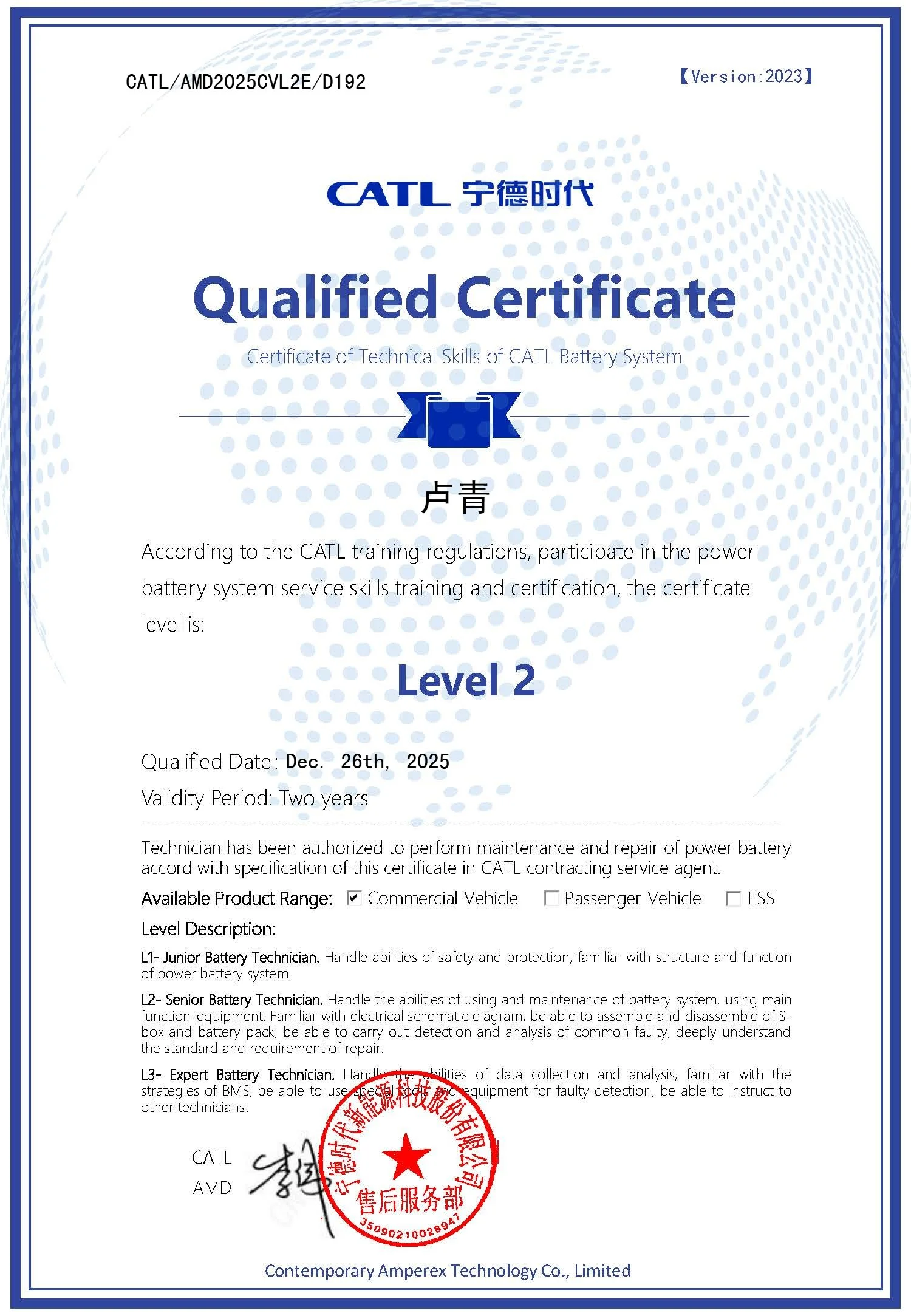 This certification is issued by CATL (Contemporary Amperex Technology Co., Limited) and applies specifically to commercial vehicle battery systems, confirming our capability to work in accordance with CATL’s OEM service standards, procedures, and equipment requirements.